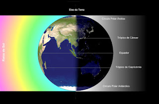 O eixo da Terra, que é a linha imaginária que liga o Pólo Norte ao Pólo Sul, é inclinado 23 graus e meio em relação à linha de direção da órbita que o Planeta percorre durante 365 dias em torno do Sol.