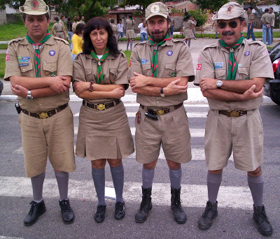 Chefe Charles à esquerda e, na sequência, os chefes Catarina, Arnoldo e Renê,  que é um dos fundadores e idealizador do Grupo Escoteiro Sarça Ardente, que fica à Praça Esmeralda, nº 106, no Jardim Aeroporto, em Guaratinguetá / SP